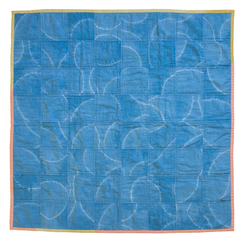 One-of-a-kind hand dyed quilt featuring a shibori technique known as stitch resist. Our kitchen towel design is created using the same shibori method.